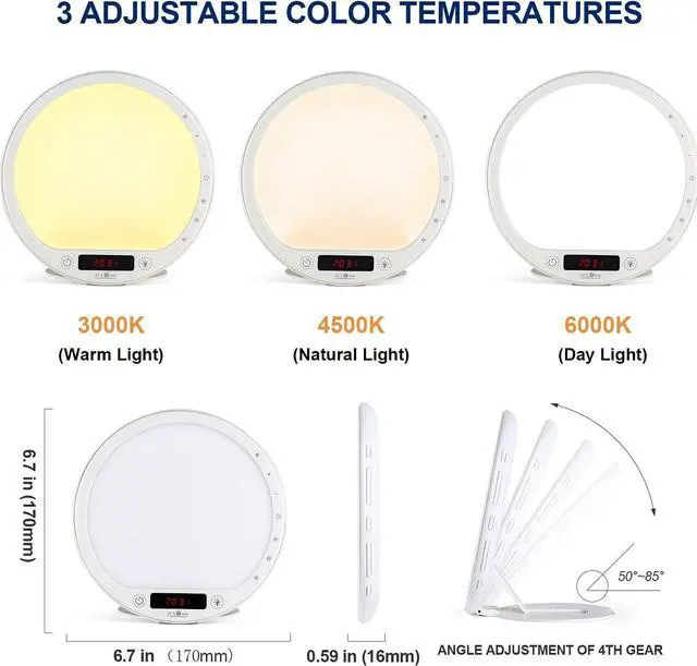 3 sets of sunlight color optionsWarm (like morning sun, color temperature 3000K), Cold (like noon sun, color temperature 6000K), Mixed color (color temperature 4500K). cold color temperature is suitable for wake up (sunrise mode), and its more effective for adjustment of body bioclock; warm color temperature is suitable for reading and sleep assisting (sunset mode).