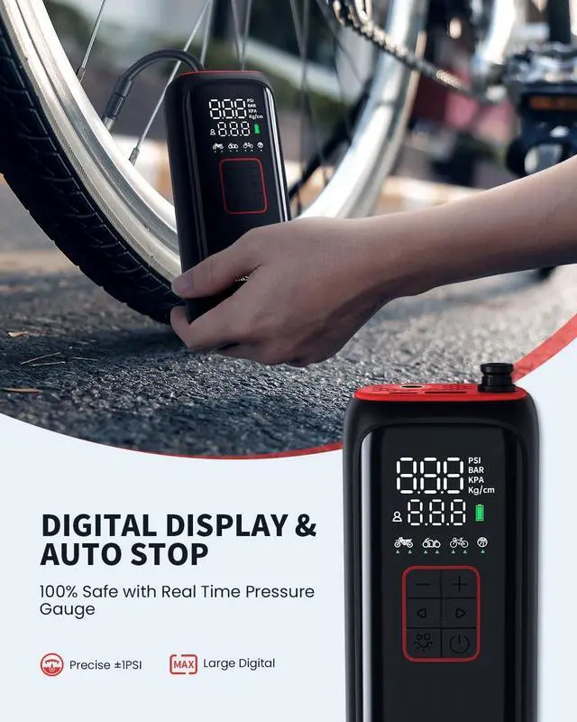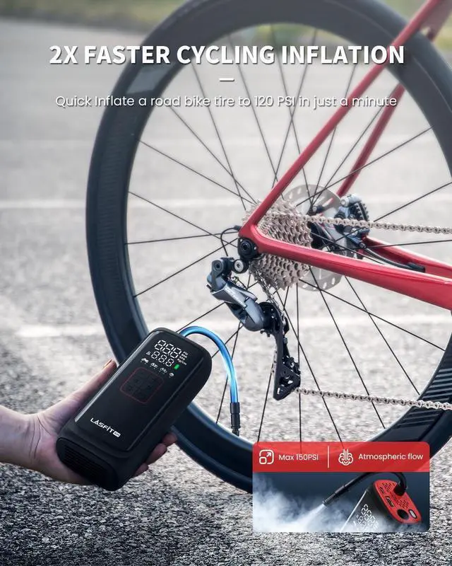 150PSI Max High Pressure InflationEssential cycling accessories for road cycling enthusiasts! This LASFIT BM1electric air pump support max to 150PSI high pressure inflation, meet all brand and all sized road bikes' wheels. Comparing with old high pressure hand floor pump and other small electric tire inflator, it can Inflate your road bike with eases. No more laborious pressing of the hand pump, 70s to inflate a 700*23C road bike tire from 0 to 100 PSI, save you great time for roadtrips.