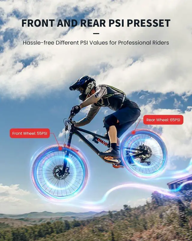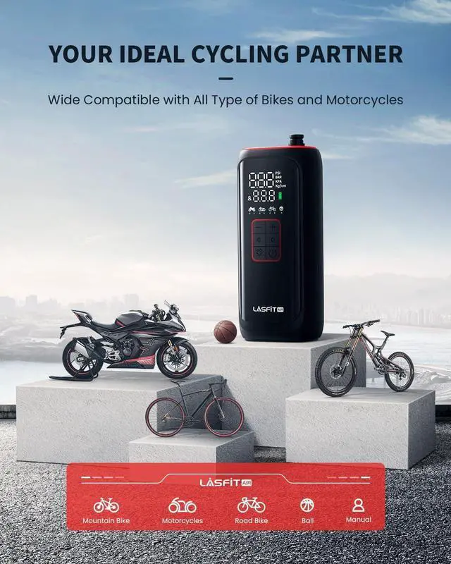 • Must Have for Smart CyclingMore convenient than all hand pumps and other electric bike pumps! Super easy to pump up your bikes: Power on, choose wheel modes, connect tubes and start your inflation, when it reaches preset pressure, it will auto stop. Designed with ligent front and rear preset tire pressure function, just set your desired pressure for front and rear tires for your mountain bike, road bike and motorcycle, then this LASFIT BM1 air pump will remember all.