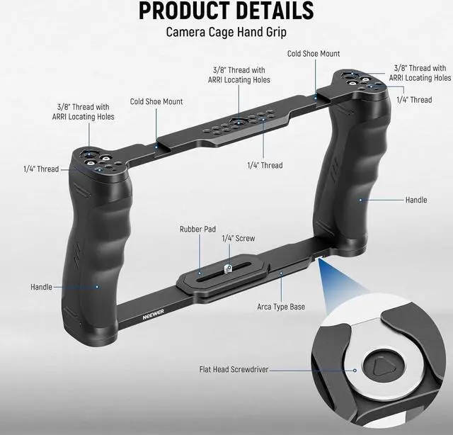 Dual Grips & Tripod Mounted The two ergonomic hand grips with synthetic leather texture and finger contours offer you a comfortable and firm grip on the cage for handheld shooting, or mount it on a tripod head via the 1/4" screw holes on the bottom, for seamless switching between handheld and tripod shooting, thanks to its Arca type base