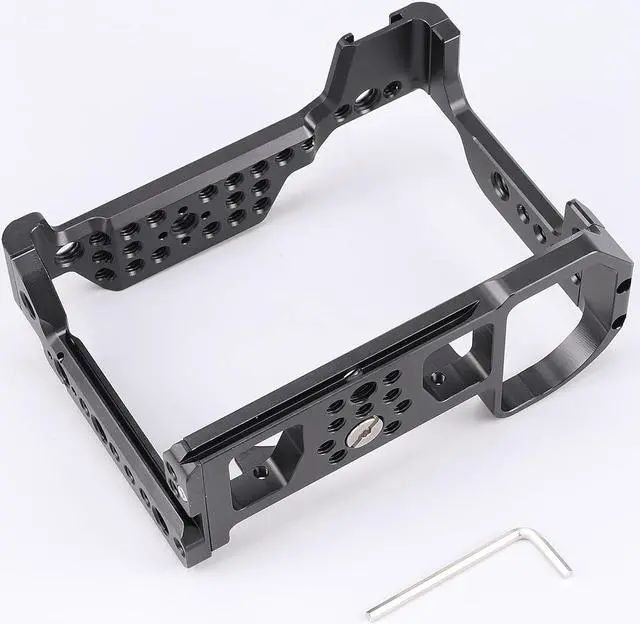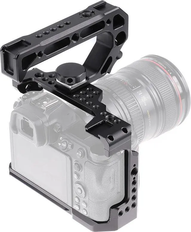 CNC Aluminum Camera Cage is specifically designed for Nikon Z5/Z6/Z7/Z6II/Z7II Camera. It is a full cage which is lightweight and perfectly form-fitting the camera. It is equipped with multiple 1/4" -20 and 3/8" -16 threaded holes, Arri 3/8 inch threaded holes, nato rail and cold shoe for accessories mounting.