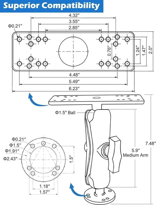 Universal Design - Includes a C size 5.9" length 1.5" double socket arm and a complete flat surface, drill-down mounting solution; The ball and socket technology allows for near-infinite adjustability. Perfectly compatible with 1.5 inches / C size / 38 mm adapters and arms from manufacturers such as RAM Mounts, Arkon, iBolt and others.