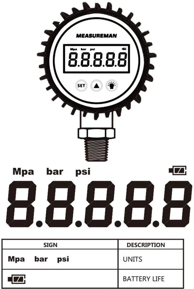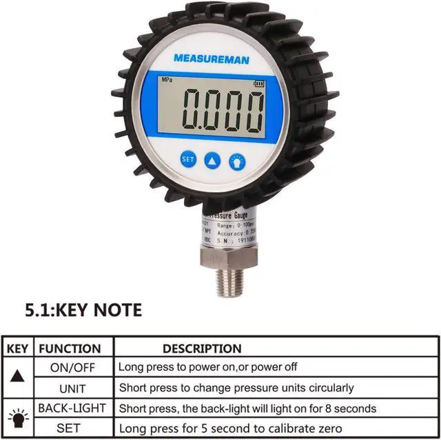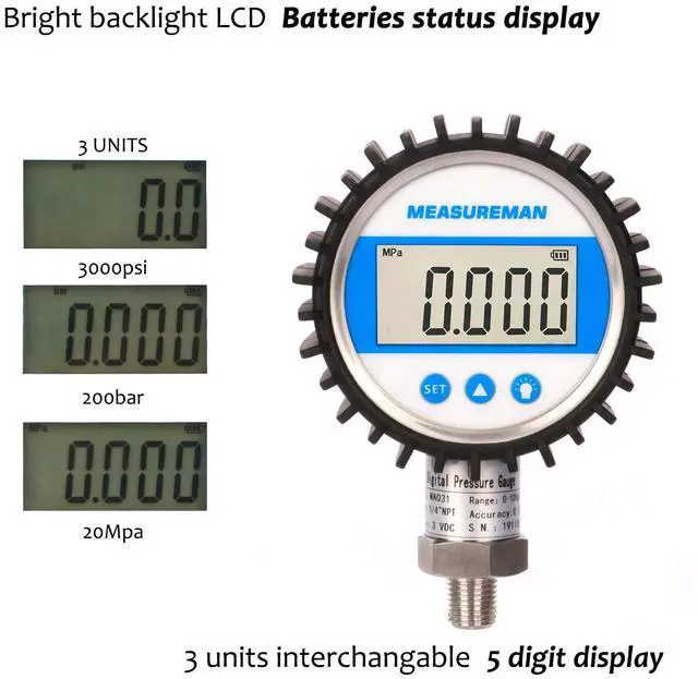 Pressure Range : 0-3000psi, bar, Mpa, 5 digit display, 3 units, 0-3000psi, bar, Mpa, 150% over load