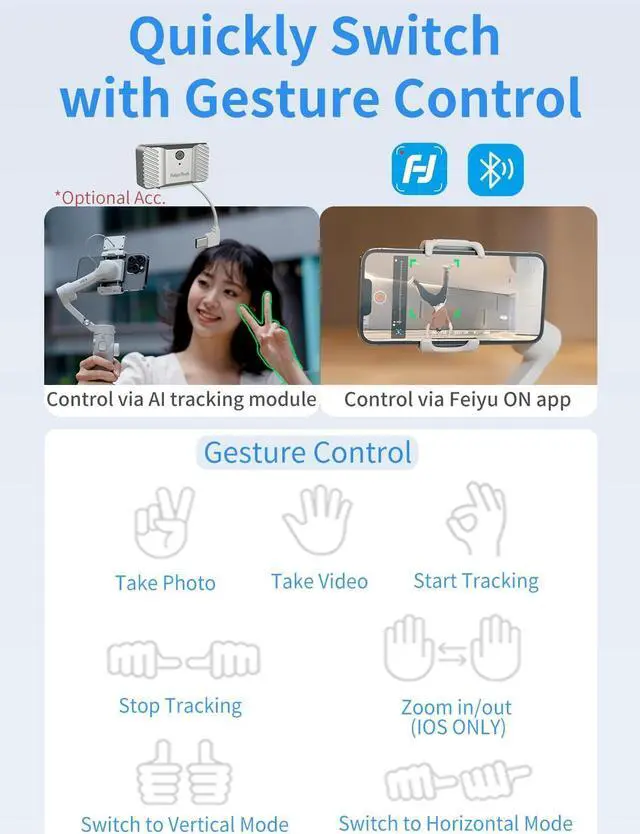 More Shooting Features: Connect "Feiyu ON" app to achieve more functions: fulfill Gesture Control, AI tracking, Time-lapse, Panorama, BeautyCam/filter, Video Edit, and other functions. Multiple gesture controls for fun solo shots, selfies or group photos. Perfect gimble for iPhone and Android video recording.