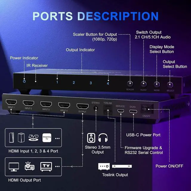 What You GetHDMI Multiviewer x1, IR Remote x1, Power adapter x1, USB-A to USB-C Power Cable x 1, User Manual x1 with hassle-free 2-year warranty and lifetime technical support. Feel free to reach our friendly customer service if you have any questions.