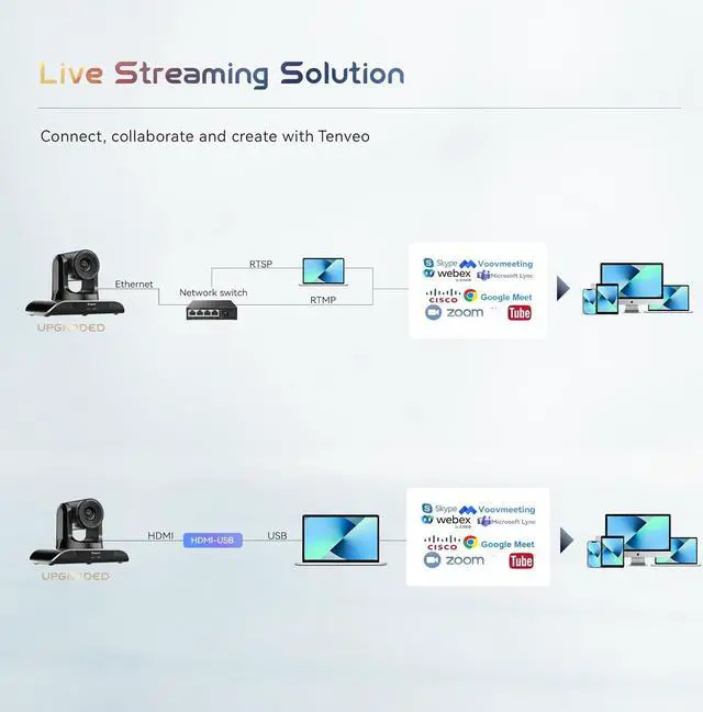 The IP Live Streaming Camera can be compatible with the current popular video/meeting software, including Zoom, Skype, YouTube, Facebook Messenger, Teams, Facetime, Google Hangout, OBS, Google Meet and so on. It supports Windows 7/ 8.1 /10, Mac OS 10.10, Linux, Android or higher. The streaming camera is also widely used at video calls, video conferences, online courses, church live broadcasts, Tele-Medicine, remote training, remote interviews, distance education, etc.