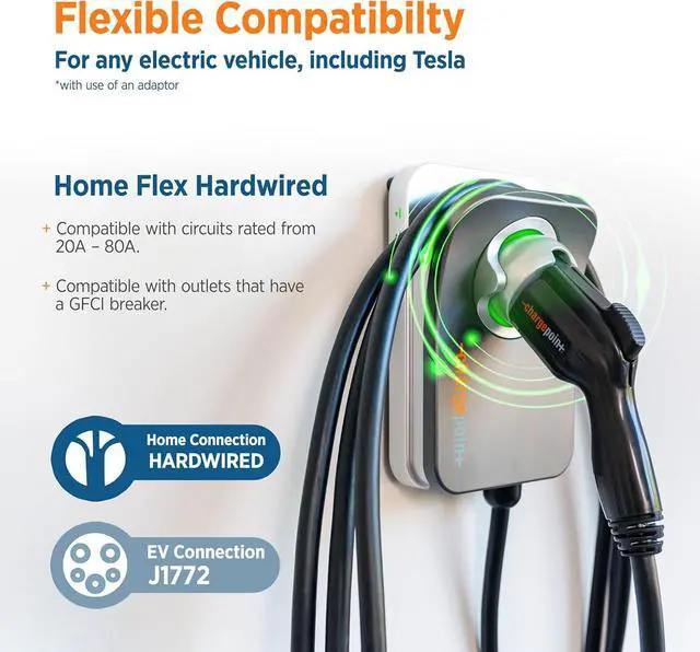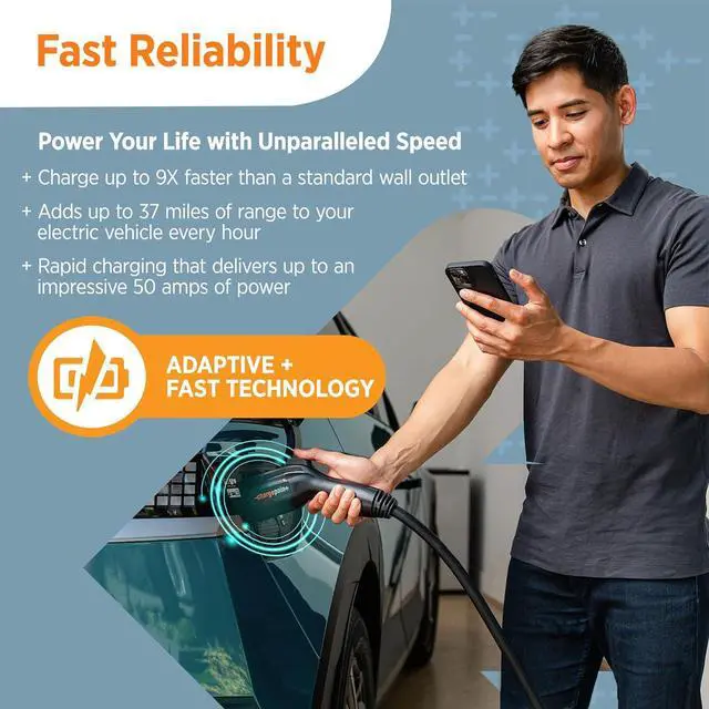 Fast & Powerful: This EV charger charges up to 9 times faster than a 110V outlet, delivering 37 mi/hr. It features a J1772 connector for all non-Tesla EVs and requires a 20A or 80A circuit. For Tesla EVs, this will require an adapter.