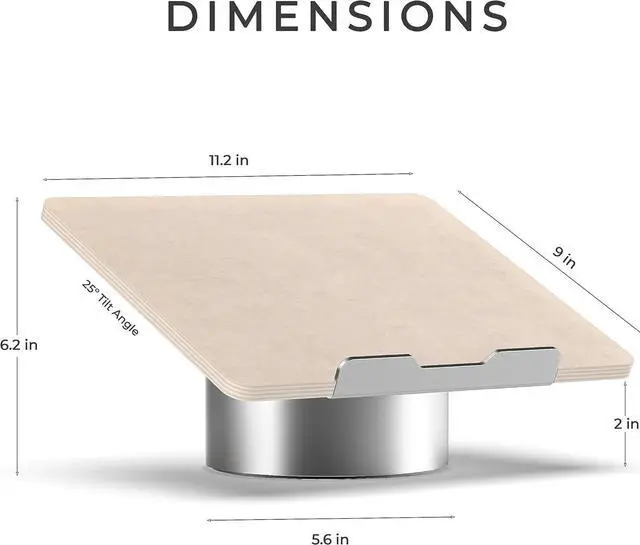 Dimensions and specifications: 25 degree angle tilt, 5.6 inch metal base diameter. 11.2 inch width x 9 inch length top platform, 6.2 inch rear height, 2 inch front height. See product images for detailed dimension graphic.