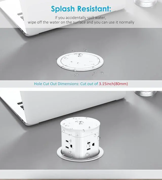 Automatic pop up power grommet made of Refined Hardened Scratch-Resistant PVC Plastic.Splash Resistant:If you accidentally spill water,wipe off the water on the surface and you can use it normally.