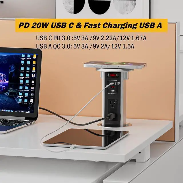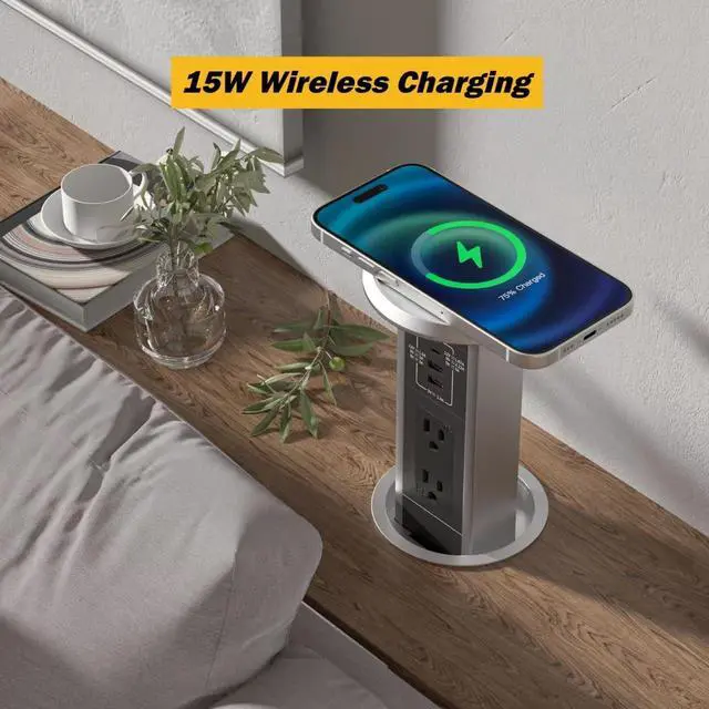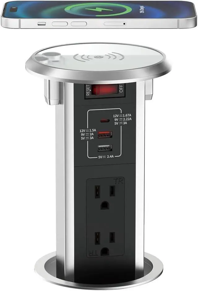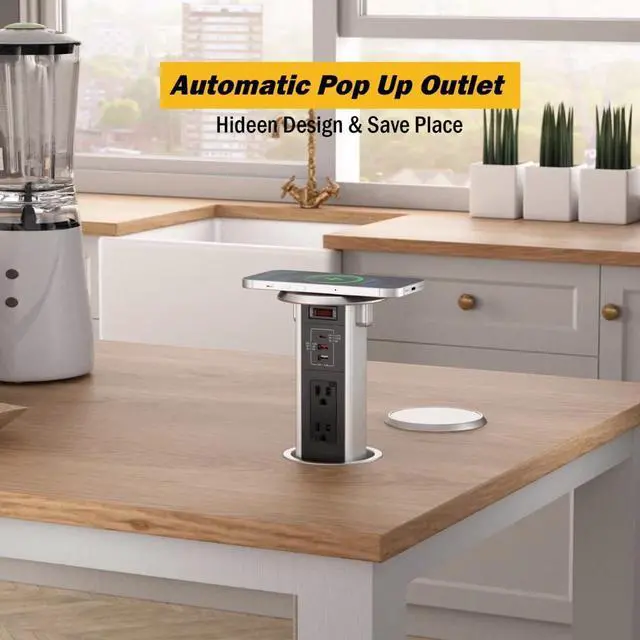 Automatic Pop up Outlet for Countertop with 15W Wireless Charger, 4" Hole Hidden Recessed Pop Up Socket,PD 20W USB C,2 TR AC Plug, ,2 USB A Desk Charging Station for Conference Kitchen Workbench