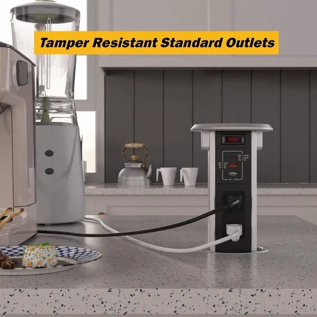 Easy to InstallThe pop up plugs for countertops can be installed vertical or horizontal, Cut a 4-4 3/25 Inch10-10.5cm) hole, remove the ring and slide the countertop pop up outlet body from top, tighten up the ring from bottom
