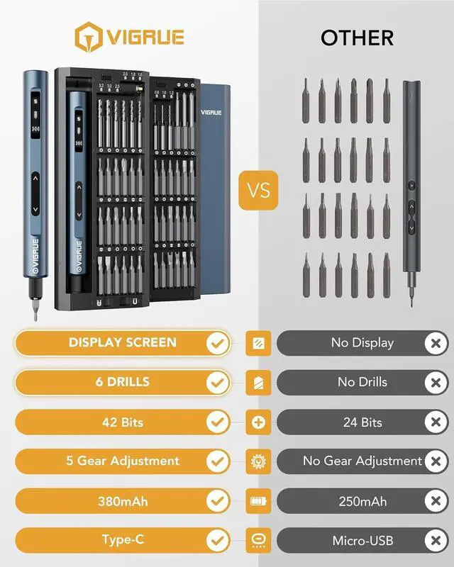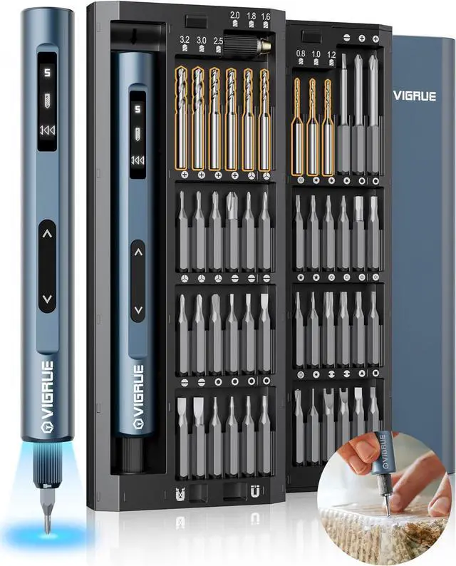 Magnetic Design & Dual ModeThe case of this VIGRUE mini electric screwdriver set closes magnetically, and is loaded with a 48 bits ordered by size. With a magnetized area, the drill can be magnetized when it touches. Buttons for forward and reverse rotation of the power screwdriver are clearly marked. This dual-mode meets your requirement of tightening or loosening screw bits