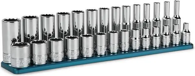 These high performance 12-point sockets are what you need to tackle 12-point fasteners as well as hex and square fasteners. Premium Chrome Vanadium steel tempered with our proprietary heat treatment process to withstand more torque. MaxChrome plating, achieved through thorough polishing and careful application of chrome protective plating, ensures durability and corrosion resistance. Precise 12-point socket with WaveDrive design grips fasteners more tightly than traditional design, preventing fastener rounding and giving you more leverage. 28-piece set includes (14) 1/4 in. drive 12-point deep sockets: 4, 4.5, 5, 5.5, 6, 7, 8, 9, 10, 11, 12, 13, 14, 15 mm, (14) 1/4 in. drive 12-point shallow sockets: 4, 4.5, 5, 5.5, 6, 7, 8, 9, 10, 11, 12, 13, 14, 15 mm. Comes with a billet aluminum socket rail made by Westling Machine in the USA. Capri Tools high performance sockets are trusted by professionals for even the most demanding applications. We use premium Chrome Vanadium steel tempered with our proprietary heat treatment process to make these sockets and drivers. They are durable and withstand more torque. Each socket underwent careful polishing and protective plating process to achieve our own MaxChrome finish. The 12-point WaveDrive design grips fasteners more tightly than traditional design, preventing fastener rounding and giving you more leverage. 28-piece set includes (14) 1/4 in. drive 12-point deep sockets: 4, 4.5, 5, 5.5, 6, 7, 8, 9, 10, 11, 12, 13, 14, 15 mm, (14) 1/4 in. drive 12-point shallow sockets: 4, 4.5, 5, 5.5, 6, 7, 8, 9, 10, 11, 12, 13, 14, 15 mm. Comes with a billet aluminum socket rail made by Westling Machine in the USA.