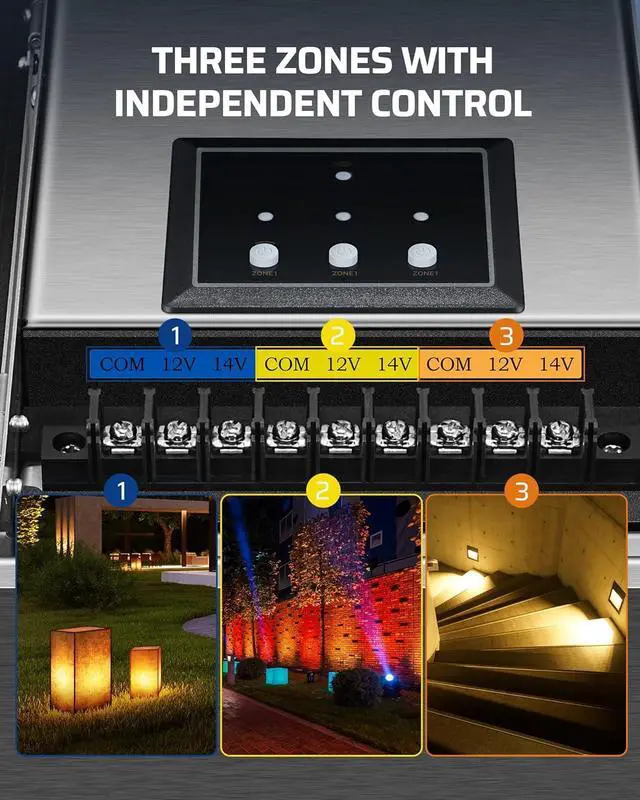 [3 Independent Control Zones] 120V 300W outdoor lighting transformer features 3 zones, providing independent control outputs, simply press the "Zone" button to select 12V/14V AC output; you can control landscape lights, yard lights, and walkway lights in 3 separate landscape systems, customizing your outdoor lighting