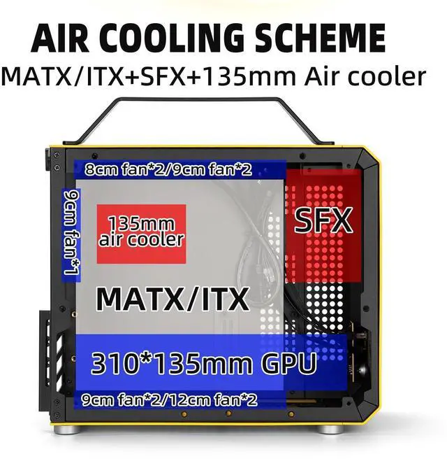 Accommodates 135mm-tall air coolers (e.g., KK135) and up to 6 fans (9cm/bottom 12cm). Optimized airflow paths reduce CPU/GPU temperatures by 10-15% in stress tests