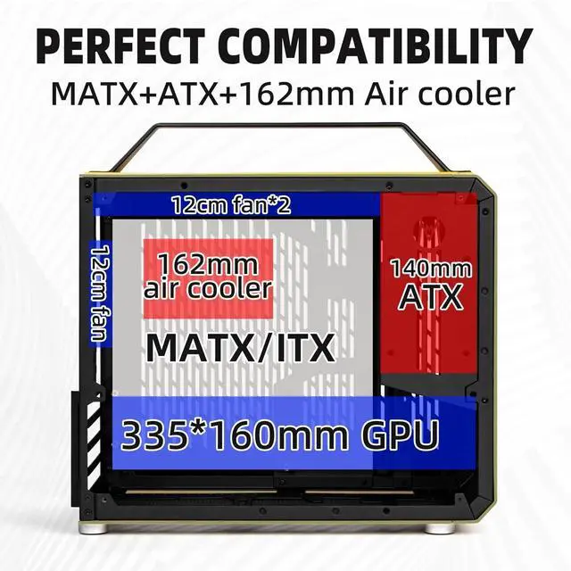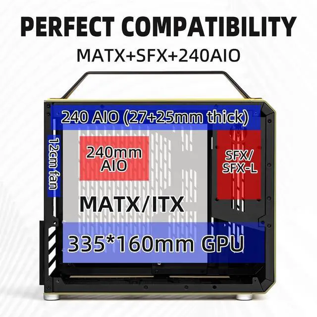 Ultra-Compact & Portable 17.9L chassis with a top carry handle for easy mobility between desks or locations. ^^ Dual Cooling Configurations Choose between 240mm AIO + SFX PSU or 162mm Air Cooler + ATX PSU to match your thermal needs. ^^ High-Density Hardware Layout Efficiently accommodates MATX motherboards, full-length GPUs, and robust cooling in minimal space. ^^ Sleek Minimalist Aesthetic Aluminum panels and clean lines blend seamlessly into office or living room environments. ^^