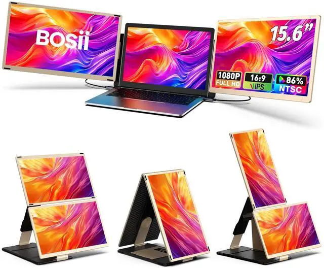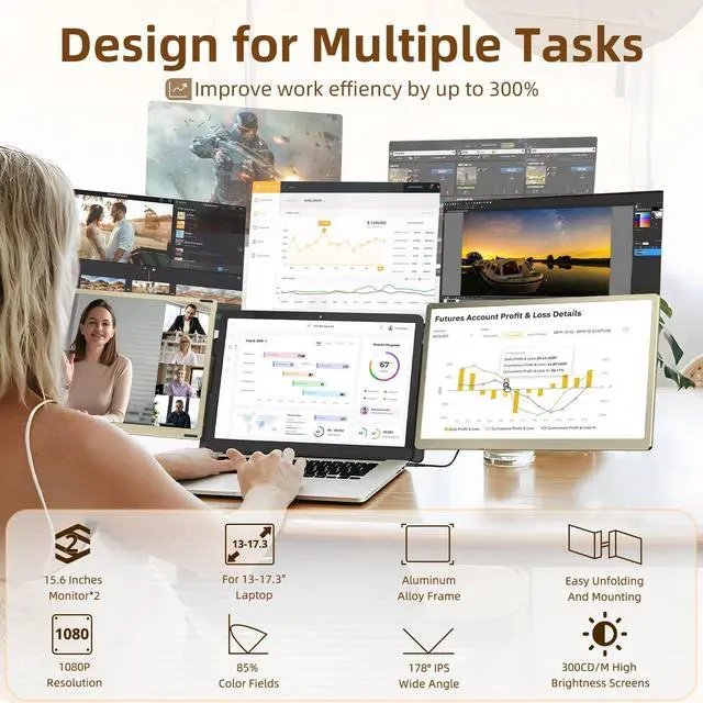 Upgraded Detachable & Magnetic Stand for Ultimate FlexibilityExperience unparalleled versatility with the detachable and magnetic stand, allowing 235 horizontal and 90 vertical rotation. Customize your setup with 11+ screen arrangements, including landscape, portrait, and stacked configurations. The magnetic build ensures stability while enabling easy detachment for single-screen use, perfect for on-the-go productivity. ^^ Stunning 1080P FHD IPS Display for Immersive VisualsEnjoy crystal-clear visuals with the 15.6 -inch FHD IPS screen, featuring 1920x1080 resolution, 300 nits brightness, and an 85% NTSC color gamut. Ideal for work, gaming, or multitasking, this monitor delivers vibrant colors and sharp details for an enhanced viewing experience.