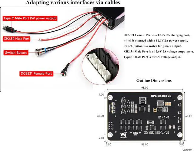 ---Interface Definition: DC5521 Female Port is a 12.6V 2A charging port, which is charged with a 12.6V 2A power supply. Switch Button is a switch for power output. XH 2.54 Male Port is a 12.6V 2A voltage output port. Type-C Male Port is for 5V voltage output.