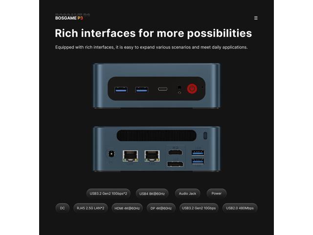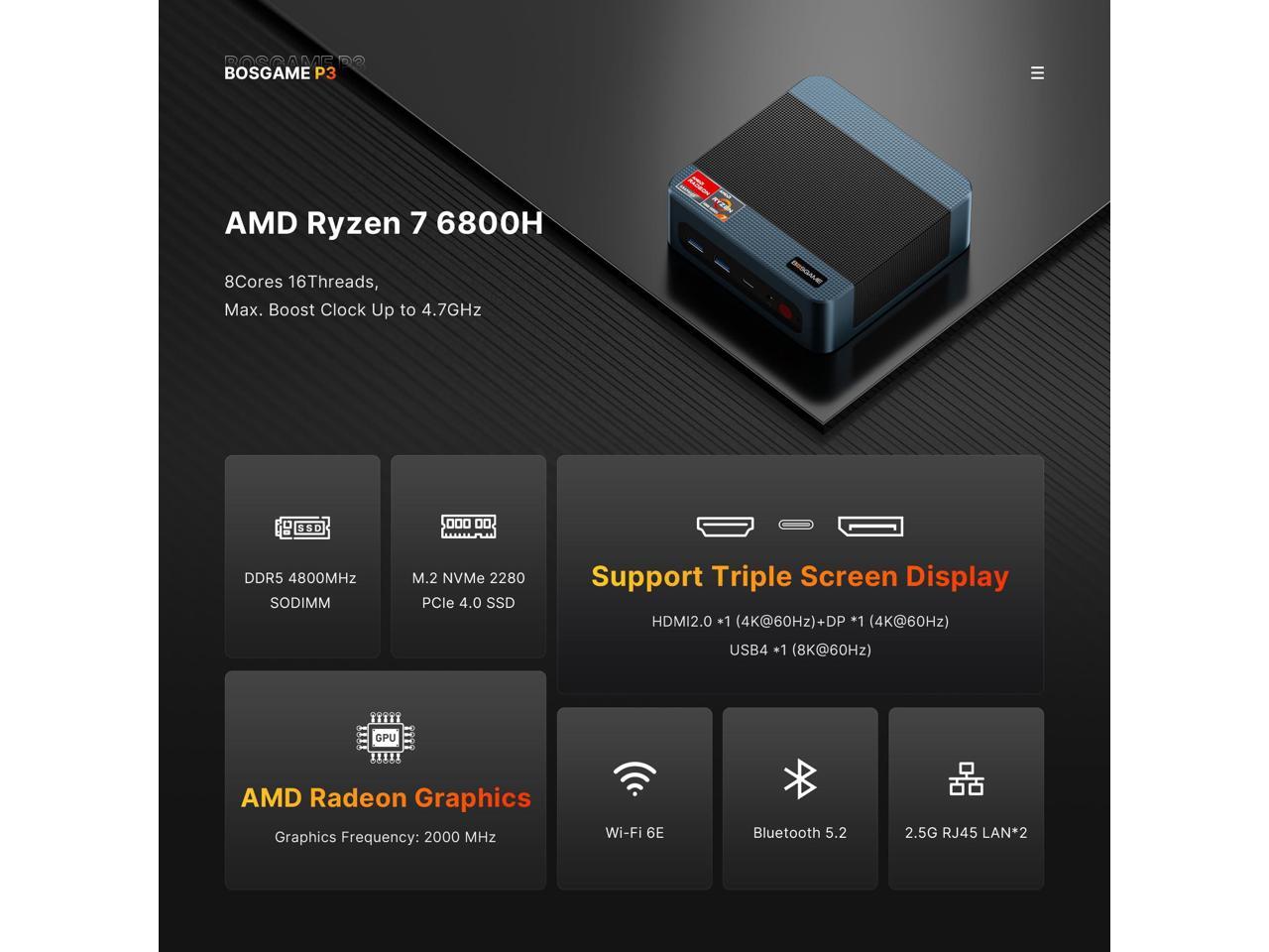 - [(Powerful Ryzen 7 6800H Processor)] BOSGAME P3 Lite Mini PC features the AMD Ryzen 7 6800H processor with 8 cores and 16 threads, up to 4.7GHz, and Radeon 680M GPU (1900MHz). Ideal for design software (Photoshop, Premiere, CAD) and popular games like PUBG, LOL, and PS3 emulators.