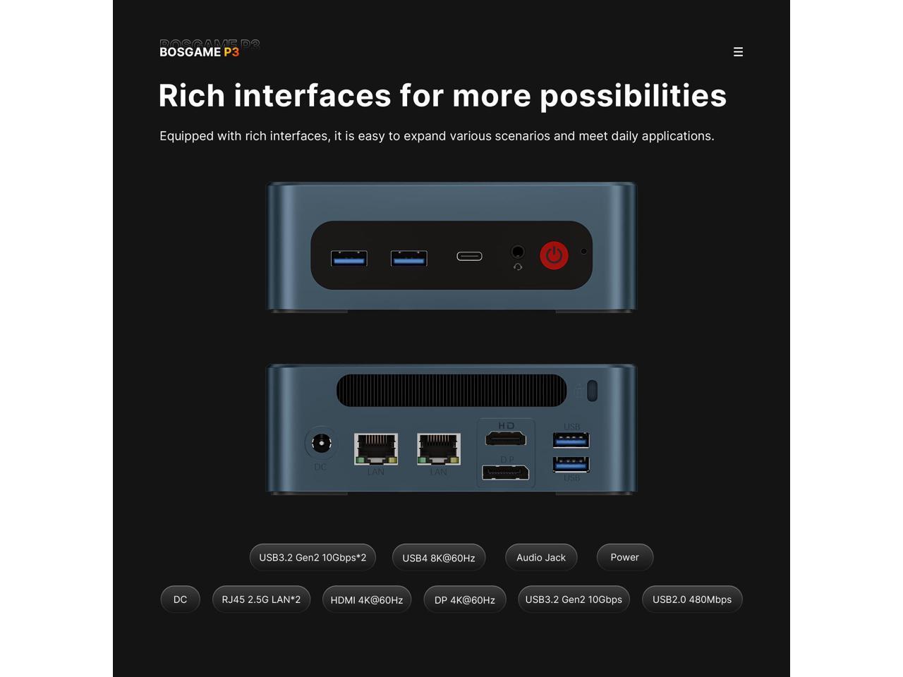 - [(Triple Display & USB4 8K@60Hz)] Bosgame Ryzen 7 Micro PC allows for triple displays via 1*HDMI2.0, DP x1 and USB4 8K@60Hz output, catering to the demands of daily design work and most low-power games. Run AI training, data processing, and