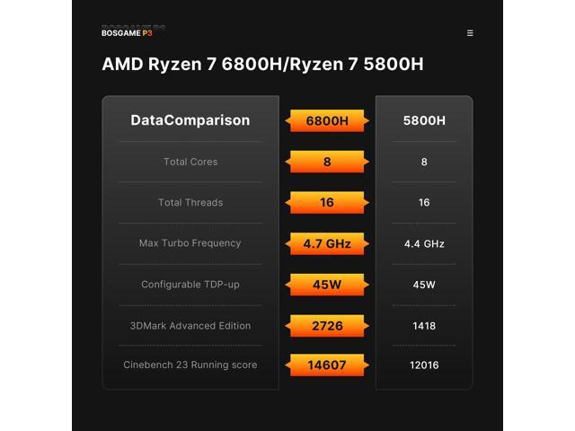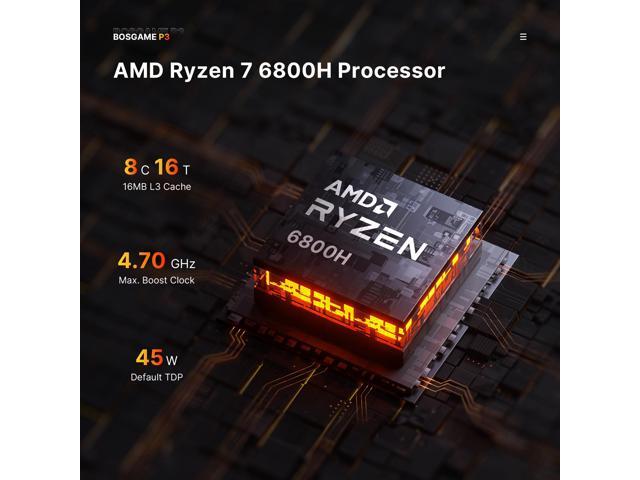 - AMD Ryzen 7 Mini PC: The BOSGAME P3 Lite is powered by the latest AMD Ryzen 7 6800H processor, designed for smooth and powerful multitasking. In PCMark 10 and Cinebench benchmark testing, the Ryzen 7 6800H delivers a 19.2% boost in overall performance and up to 25.6% improvement in single-thread computing performance compared to the previous generation processor. With 8 cores, 16 threads, and advanced Zen 3+ architecture, this CPU ensures exceptional speed, efficiency, and responsiveness for both professional and personal use.
