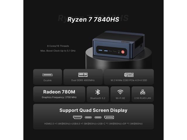 - Ryzen 7 7840HS Performance ProcessorThe BOSGAME M4 Neo Mini Gaming PC is equipped with the AMD Ryzen 7 7840HS (8C/16T, up to 5.1GHz) with Radeon 780M graphics, it handles multitasking, gaming, and resource-intensive applications like video editing and coding efficiently.