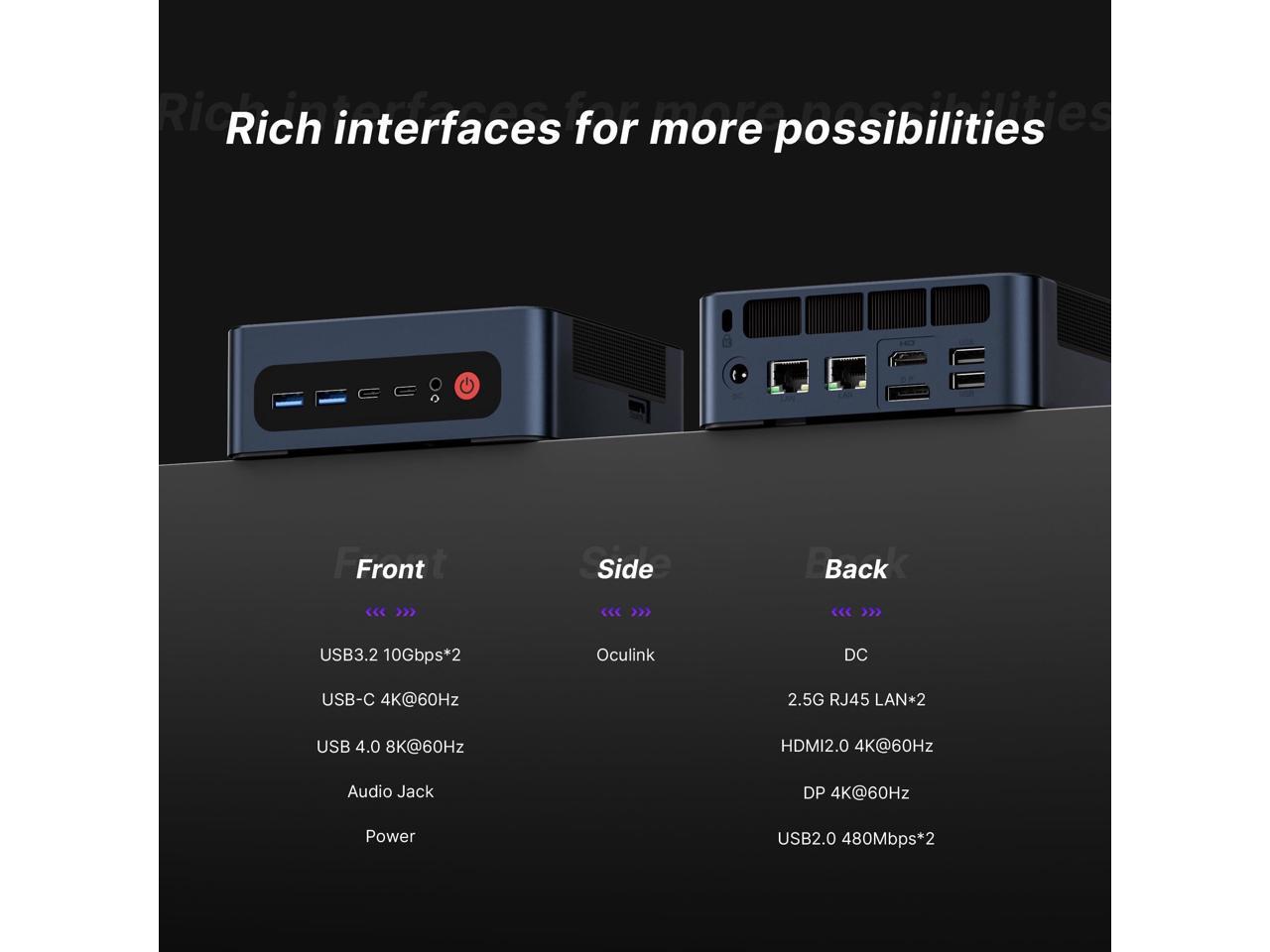 - Mini PC with Oculink Port Features an Oculink Port supporting PCIe 4.0 with 40Gbps transfer speeds, enabling eGPU connections for enhanced graphics and NVMe SSD RAID arrays for faster data access. The direct PCIe connection minimizes latency, ensuring stable performance for gaming, video editing, or multitasking.
