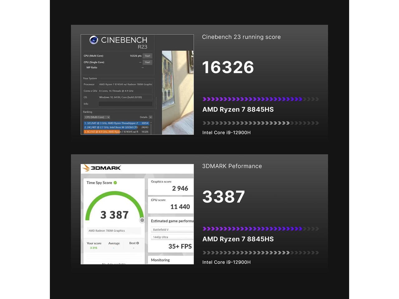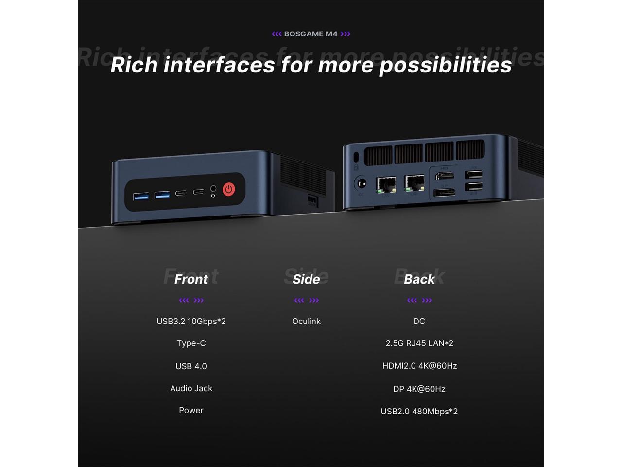 - Ryzen 7 8745HS Performance ProcessorThe BOSGAME mini pc is driven by the AMD Ryzen 7 8745HS (8C/16T, up to 4.9GHz) with Radeon 780M graphics (12 CUs, 2.7GHz), delivering desktop-level power for AAA gaming, 4K video editing, 3D rendering, and live streaming. Multitask seamlessly between heavy workloads like CAD modeling and code compilation.