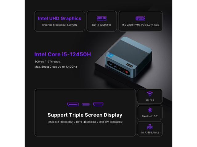 - 12th Gen Intel i5-12450H Processor: BOSGAME Mini PC P2 Neo is equipped with the 12th Gen Intel core i5 12450H processor, 8 cores and 12 threads, with a maximum speed of 4.4GHz. Ultra-compact Mini PCs provide flexible, comprehensive solutions for a wide range of office, business,digital signage applications.