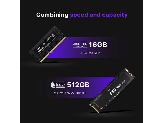 - 16GB DDR4 RAM 512GB PCIe SSD: Mini computers standard with dual-channel 16GB DDR4 (2x8GB) 3200Mhz SODIMM and a 512GB NVMe PCIe 3.0 x4 M.2 2280 SSD, supporting up to 64GB of memory and 2TB of SSD. It can accommodate a large number of files, videos, etc., without the need to frequently clean up or transfer files.