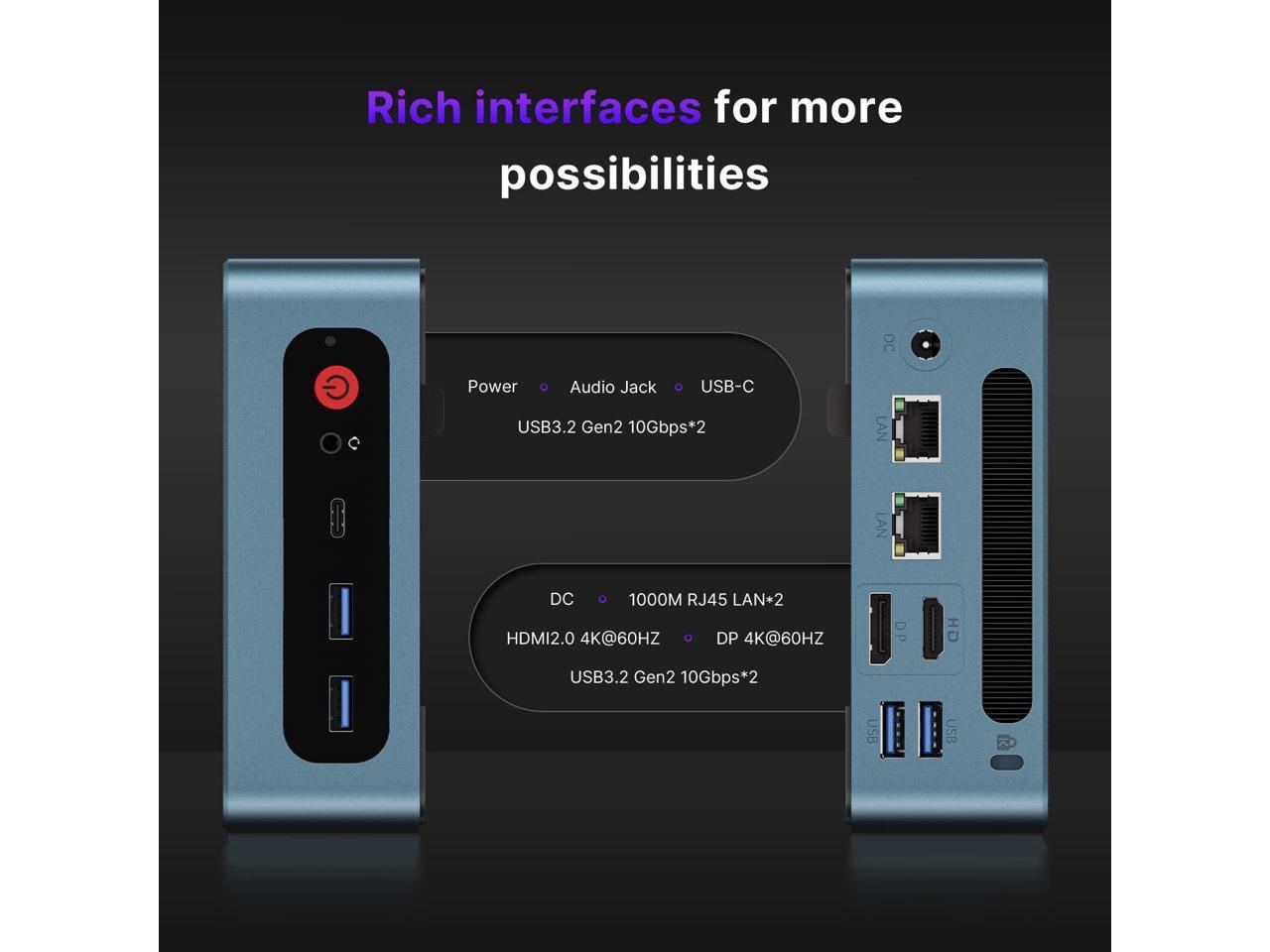 - Dual RJ45 Gigabit LAN: Practical design dual Gigabit Ethernet ports design provides more applications, such as firewalls, multichannel aggregation, file storage servers, etc. At the same time, BOSGAME P2 Neo desktop computers have Triple-band Wi-Fi 6E, BT5.2 with more substantial resisting disturbance and more stable wireless signal.