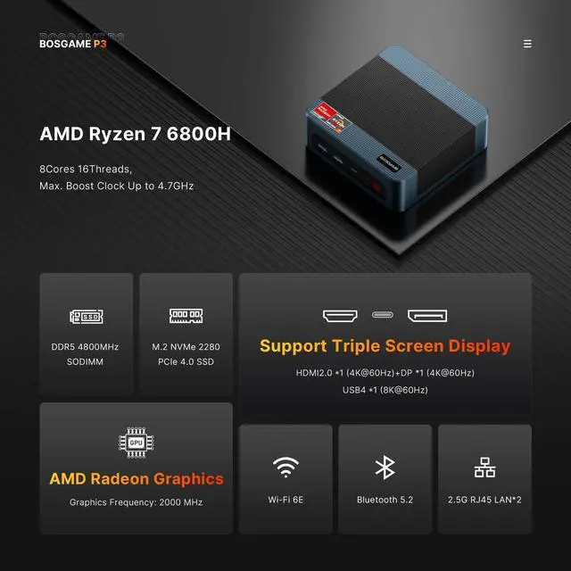 Powerful Processing Performance: BOSGAME mini pc P3 Lite equipped with the AMD Ryzen 7 6800H processor, delivers desktop-grade performance in a compact form factor. With 8 cores and 16 threads, a base clock of 3.2GH z, and a boost clock up to 4.7GH z, it handles multitasking, high-performance gaming, and demanding creative workloads with ease.