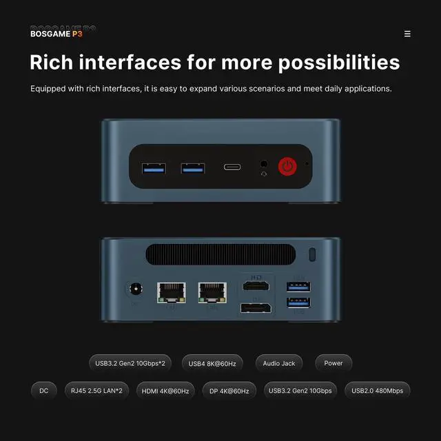 Network Enthusiasts: BOSGAME Ryzen 7 mini PC 6800H features dual 2.5G RJ45 LAN ports, delivering blazing-fast network speeds of up to 2.5G bps, which is 2.5 times faster than traditional Gigabit Ethernet. Its the perfect solution for setting up soft routers, NAS (Network Attached Storage), or home servers, catering especially to users with multiple devices and high-bandwidth requirements, such as home media centers, cloud backups, or small office networks. ^^ Triple Display SupportCombines the versatility of USB 4.0 (40Gbps) with HDMI 2.0 and DP interfaces, supporting triple displays at 4K@60Hz. The USB 4.0 port offering blazing-fast 40Gbps data transfer speeds, seamless compatibility with Thunder bolt 3 devices like eGPU and USB-C/Thunder bolt interface docking stationer for gamers, professionals, and content creators seeking high-performance connectivity in a compact form factor. ^^ BOSGAME Mini PC