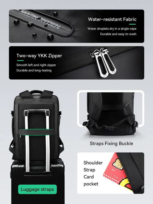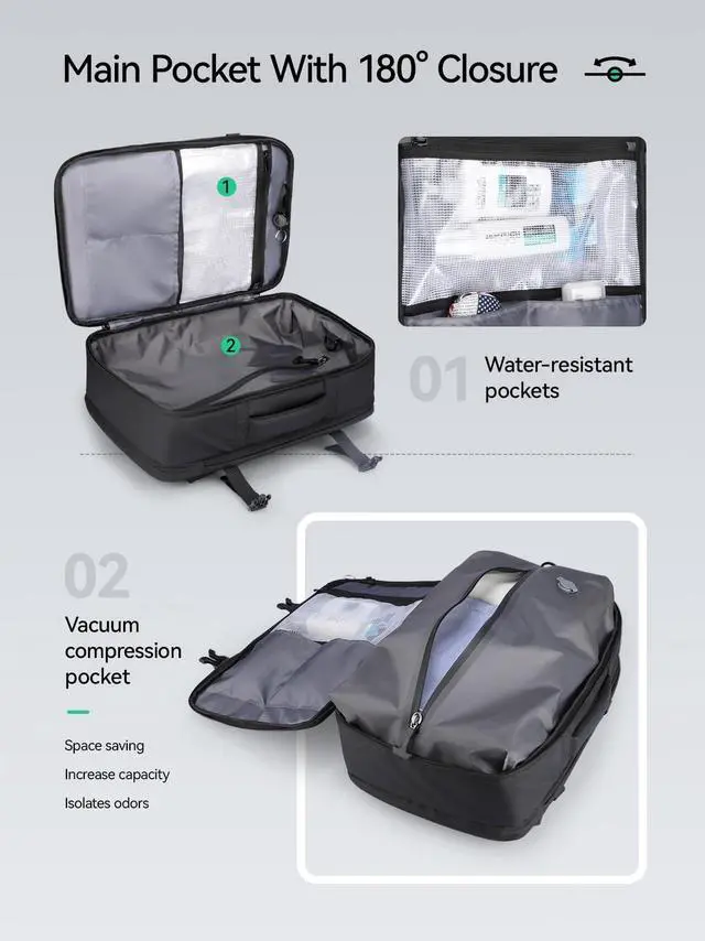 VACUUM COMPRESSIONThe MARK RYDEN travel backpack features a vacuum compression design that compresses clothing and other packable items to optimize space and allow you to carry more. To maintain the vacuum seal within the backpack, significant force is required to open the zipper, but rest assured it is highly durable and won't break