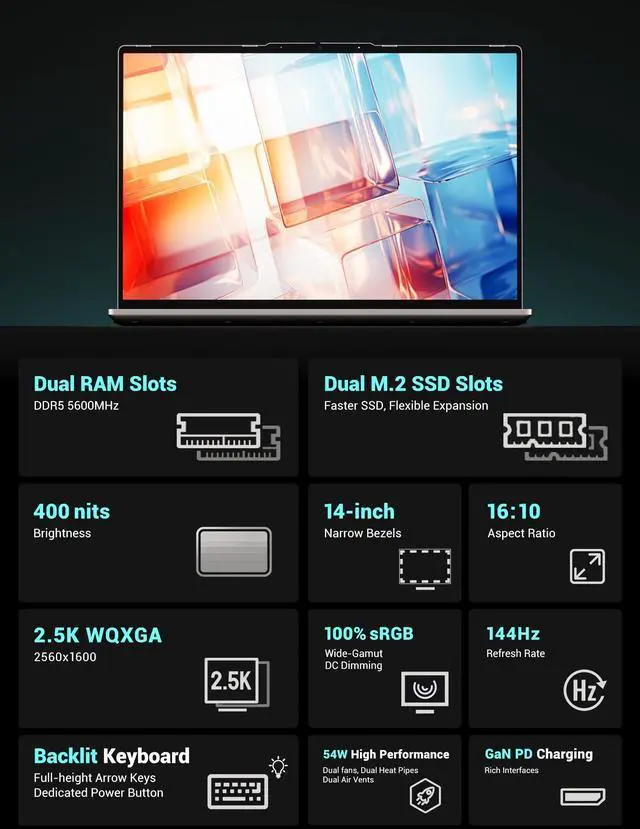 ^^ CPU suffixes mean: "" and "" indicates the most superior performance, emphasizing performance, TDP of 35-54W; and "" indicates low voltage and low power consumption, TDP is 15-28W, suitable only for basic use; "" indicates the lowest voltage and the lowest power consumption, TDP is 15W ^^ AD Surface Metal Shell with Comfortable Screen Equipped colorful anti-glare IPS display with WQXGA 2.5K 25601600 high-resolution, allowing for crystal-clear viewing of movies and TV shows. High 144Hz refresh rate delivers vibrant colors without straining your eyes, ensuring a smooth and comfortable viewing experience. ^^ Run Faster and SmootherEquipped with 16GB DDR5 5600MHz memory (dual channel, up to 64GB, 32GBx2) and 512GB PCIe 3.0 M. 2 SSD (dual hard drive interface, PCIE 4.0 support, expandable up to 8TB), you don't have to worry about slow operation, lag, and other problems caused by insufficient capacity, meeting diverse needs. The upgraded user-friendly design lets you expand memory and storage effortlessly. ^^ Smarter by Friendly DesignHigh-Speed Connection, supports WiFi 6 and Bluetooth 5.2 for faster file transfers. The 5050mAh/ 58.33W h large-capacity battery eliminates the anxiety of rapid power consumption.