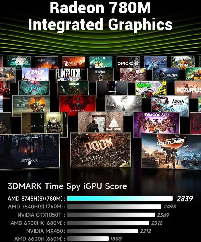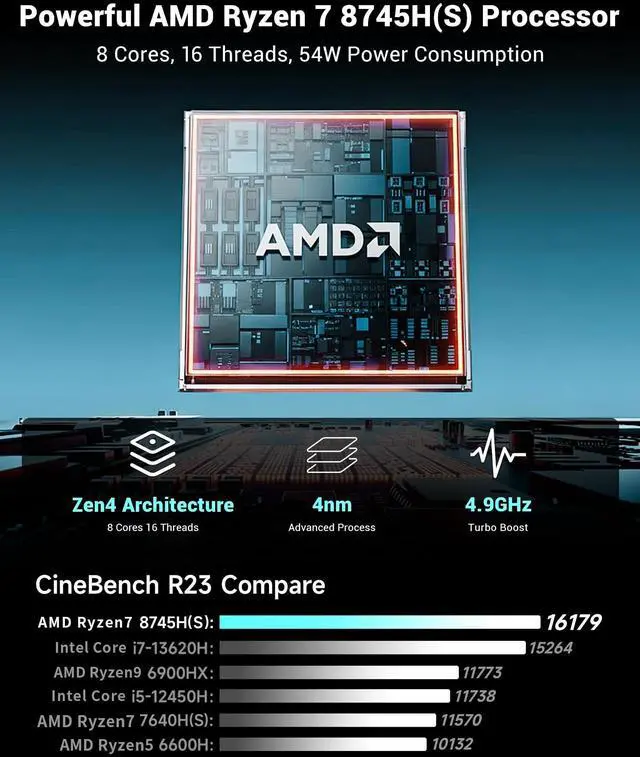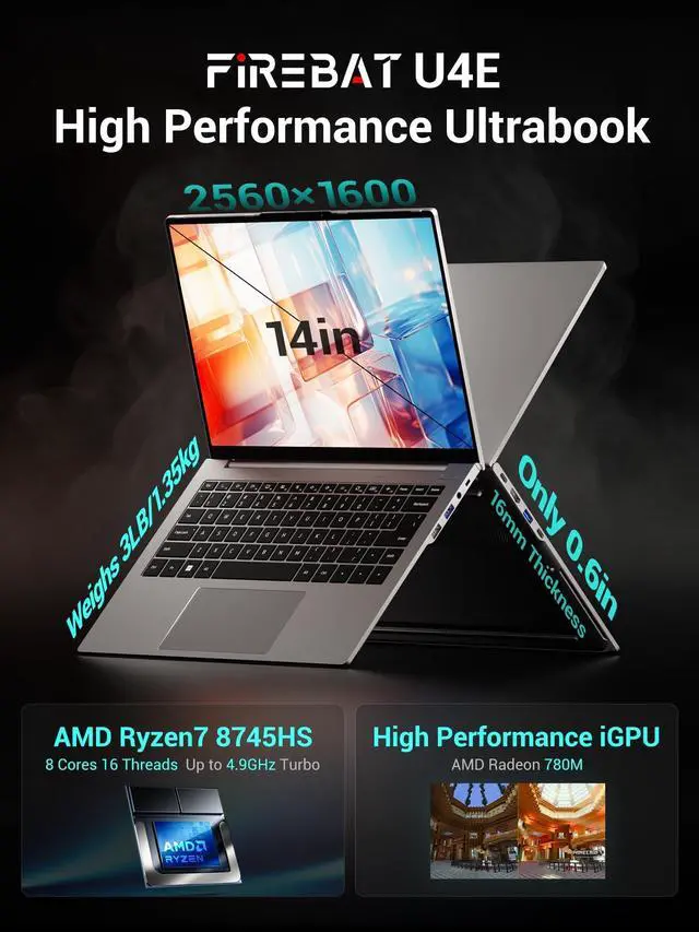 Lightweight, Portable, PowerfulFIREBAT ultrabook laptop is equipped with a 14-inch display, at just 0.6 in/16mm thickness, which is a comfortable carry-on. Making it a great ideal choice for school, work, business, or everyday travel! ^^ Hardcore PerformanceFIREBAT ultrabook notebook is powered by the AMD Ryzen 7 8745HS (8-core/16-thread) with 4.9GH z turbo speeds, which handles single and multi-threaded tasks effortlessly. Featuring Radeon 780M graphics and 54W of ultra-high performance, delivers stable performance for seamless gaming, content creation, and productivity.