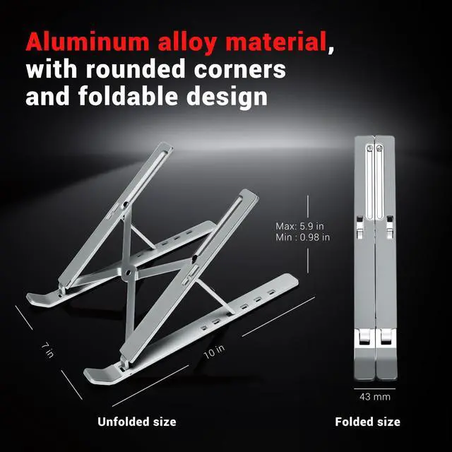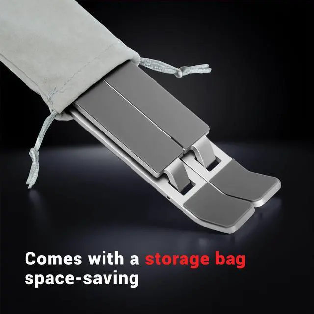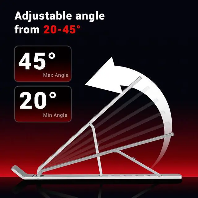 Adjustable & ErgonomicThe laptop stand for desk features 6 adjustable angles ranging from 20 to 45 ( 0.98 - 5.9 in / 25mm-150mm), allowing you to customize the angle to a comfortable working position based on your specific needs. This design is for a perfect eye level, letting you fix posture and reduce your neck fatigue, back pain, and eye strain. ^^ Portable & FoldableThis portable, foldable laptop stand is lightweight and easy to fold and carry, weighing only 0.55 lbs/ 0.25 kg. It comes with a compact storage bag that fits easily into your bag, making it convenient for use at home, in the office, at a coffee shop, or at an airport terminal.