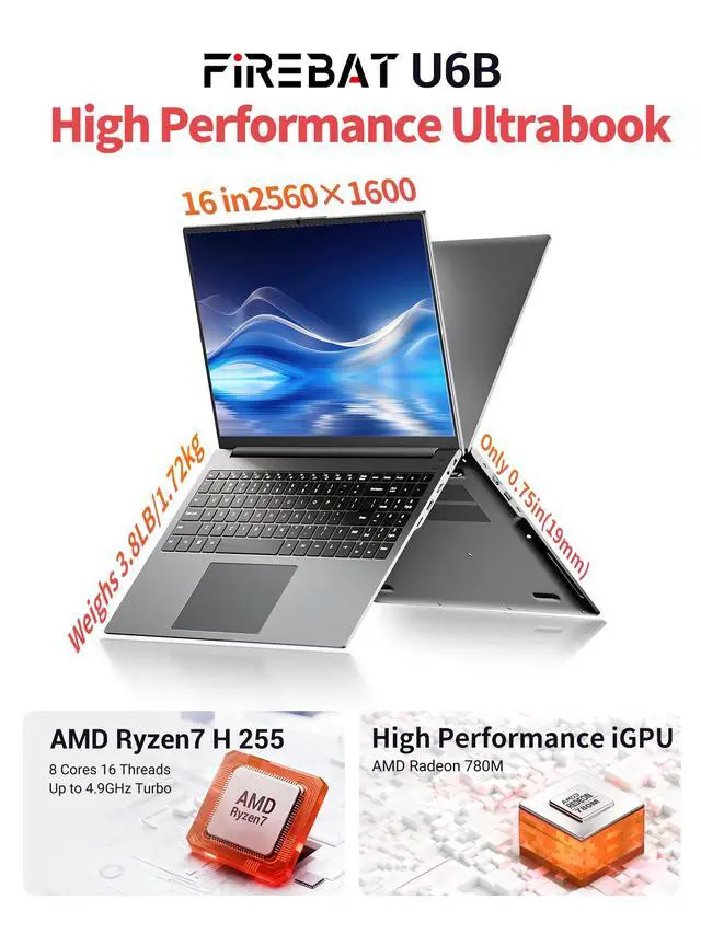 Display: 120Hz & 100% sRGBExperience breathtaking visuals on a 16-inch 2.5K (25601600) IPS display. Boasting a 120Hz refresh rate and 100% sRGB color gamut, it delivers fluid motion and vibrant, color-accurate imagesessential for designers and gamers alike. The modern 16:10 aspect ratio provides more vertical space for coding, writing, or browsing, making this laptop the ultimate workstation for students and business professionals who refuse to compromise on clarity. ^^ Ultra-Portable Design for Life on the GoPowerful performance shouldn't be a burden, staying cool even under heavy use. Built-in dual-fan, dual-heatpipe system with high-efficiency thermal grease ensures maximum heat dissipation during intense tasks. Despite this heavy-duty cooling, the FIREBAT maintains a sleek 0.75 in/ 19.12 mm Ultrabook profile. Its the perfect portable notebook computer that fits easily into your messenger bag, offering desktop-class power in a lightweight chassis designed for the modern commute or campus life. ^^ Unmatched Connectivity & Triple-Display SupportFIREBAT laptop supports triple-display expansion via HDMI and dual USB-C ports, allowing you to multitask across four screens simultaneously. Stay ahead with WiFi 6 ( 802.11AX ) and Bluetooth 5.2 for ultra-stable, high-speed wireless connections.