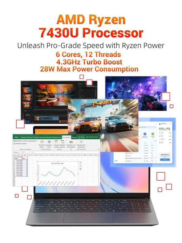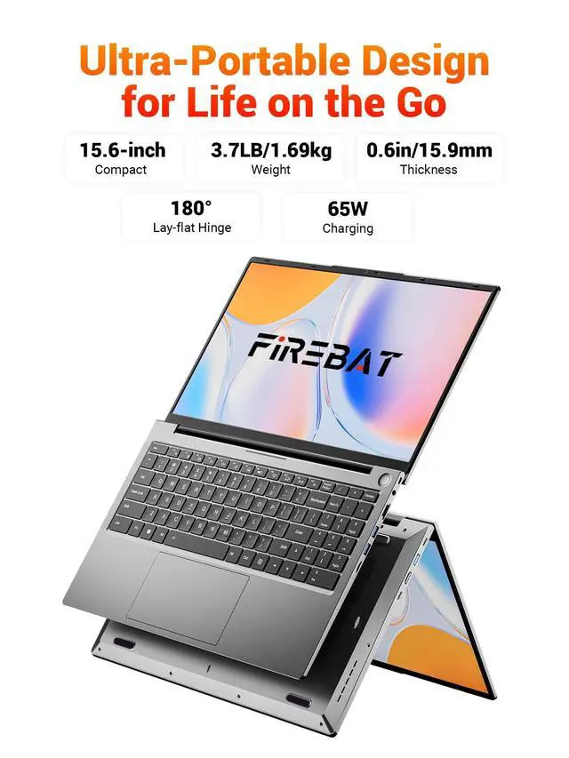 Blazing-Fast Ryzen 7000 Series Performance Experience the raw power of the AMD Ryzen 5 7430U processor. With 6 cores, 12 threads, and a boost clock up to 4.3GH z, this FIREBAT notebook computer handles heavy multitasking with ease. Whether youre crunching complex spreadsheets for business or editing high-res projects for school, the 28W max TDP and advanced cooling systemfeaturing dual heat pipes and premium thermal greaseensure your laptop stays cool and responsive under pressure. No lag, no overheating, just pure productivity. ^^ Stunning 15.6 IPS Display & Immersive Visuals Elevate your viewing experience with our vibrant 15.6 -inch IPS display.