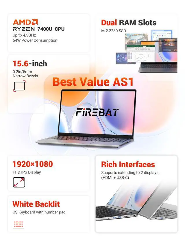 and HDMI 1.4, allowing you to run dual external monitors simultaneously. With RJ45 Ethernet, an SD card slot, and high-speed USB 3.2, you can say goodbye to messy dongles and enjoy seamless connectivity anywhere. ^^ FIREBAT laptop uses AMD Enhanced Virus Protection (NX bit) to protect your information security, so you don't have to worry about data leaks. FIREBAT has been deeply involved in the computer and accessories industry for more than 10 years. Whether for students, colleges, workers, gamers, professionals, FIREBAT can always meet your needs.