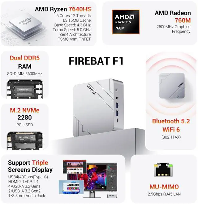 Powerful Processor PerformanceFIREBAT F1 Mini PC features an AMD Ryzen 5 7640HS processor (6-core/12-thread/up to 5.0GH z) with Zen 4 architecture, delivering a maximum turbo frequency of 5GHz and 54W full power consumption. This provides exceptional performance support for multitasking and diverse usage scenarios, effortlessly handling business operations, creative work, and gaming! ^^ Graphics OutputBuilt-in AMD Radeon 760M integrated graphics (RDNA3 architecture, 8CU, core clock 2600MHz). Supports ultra-high-resolution output via HDMI 2.1, DP 1.4, and USB4 (40Gbps, Type-C), enabling simultaneous triple 4K@60Hz displays to meet professional and entertainment demands.