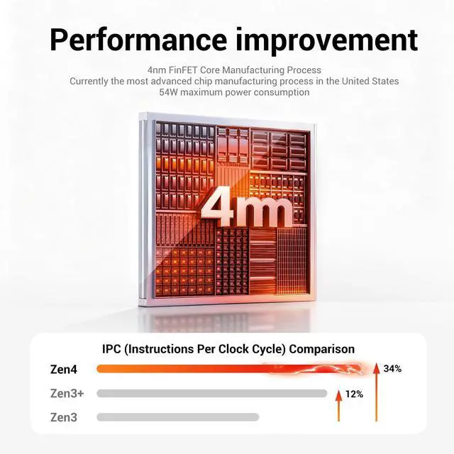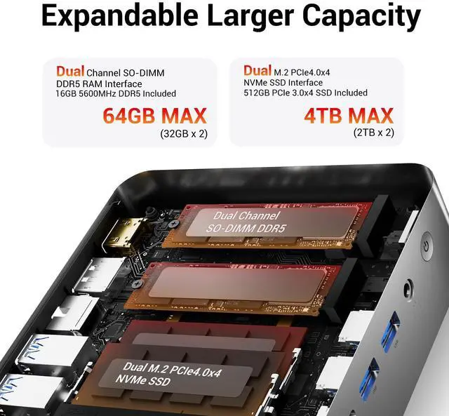 ^^ Dual ExpansionSupports dual DDR5 slots (max 64GB, 32GBx2, includes a 16GB RAM) and 2x M. 2 2280 PCIe 4.0 SSD slots (includes a 512GB PCIe 3.0 SSD), delivering high-speed data read/write performance for rapid system responsiveness. ^^ Comfortable and ConvenientThe ultra-thin, minimalist design, less than 1.57 in/40mm, makes it easy to carry with one hand. Equipped with a VESA mount, it can be mounted behind a monitor, on the back of a desk, or on a wall. A single fan and dual heat pipes ensure efficient performance (chassis temperature <40C (104F) and noise level <45dB at a distance of 2ft/60cm while maintaining full 54W power after a 15-minute stress test), allowing it to seamlessly blend into any environment, creating a clean and comfortable workspace.