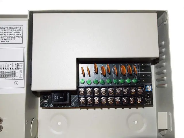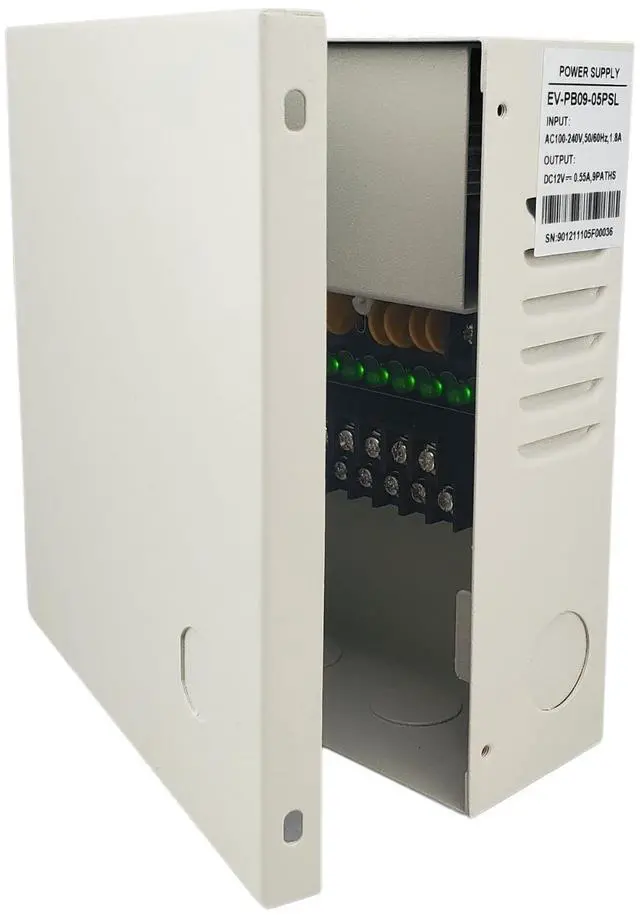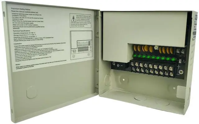 HIGH CAPACITY POWER - 12 V DC CCTV power supply box delivers 12V DC at up to 5 Amper total across 9 channel outputs - Keep 9 different outputs to neatly power up to 9 CCTV Security Cameras from one box - perfect for multi camera CCTV system projects. Input AC 110-240V ^^ WIDE COMPATIBILITY UNIVERSAL 12V DC OUTPUT with ON/OFF SWITCH - 9 channel power distribution box 12 V Work seamlessly with AHD, TVI, CVI, and standard Analog security cameras, simplifying your system installation. AHD TVI CVI analog camera power box. ^^ INDIVIDUAL PTC FUSE PROTECTION - PTC fuse protected camera power supply.