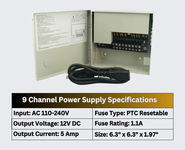 Each channel has its own resettable PTC fuse to guard against short circuits or overloads, enhancing your CCTV projets safety and reliability. ^^ METAL ENCLOSURE - LOCKABLE - Durable metal housing with key lockable lid keeps your wiring secure, prevents tampering and neatly organizes your camera system. ^^ SPACE SAVING COMPACT DESIGN - Compact security camera power supply Measuring just 6.30" x 6.30" x 1.97" this power box takes up significantly less wall-or-cabinet space than typical CCTV units, ideal for tight installations while still delivering full 9 channel 12V 5 Amper DC Power Output.