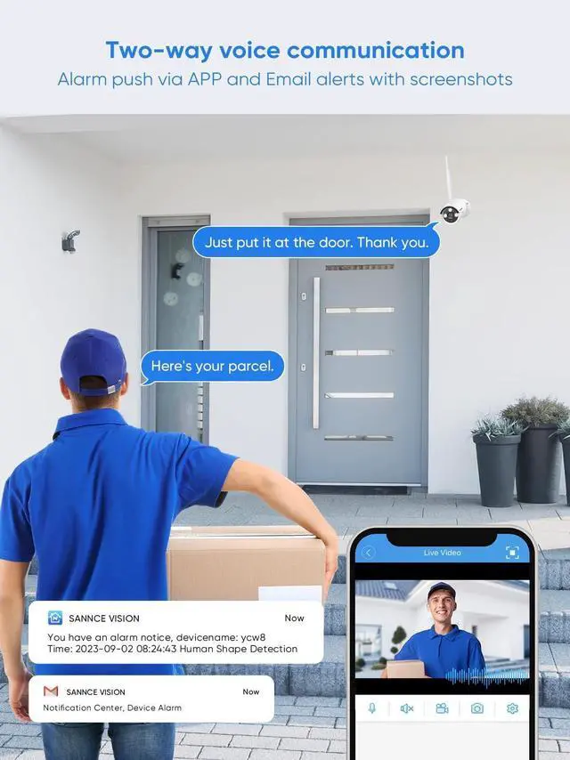 Alarm Features: The cameras are equipped with built-in microphones, while the NVR features a 3.5 mm audio output for two-way audio communication. The system supports mobile push notifications for alarms via the app and email. Email alerts also include snapshot images for quick reference. ^^ Versatile Storage and