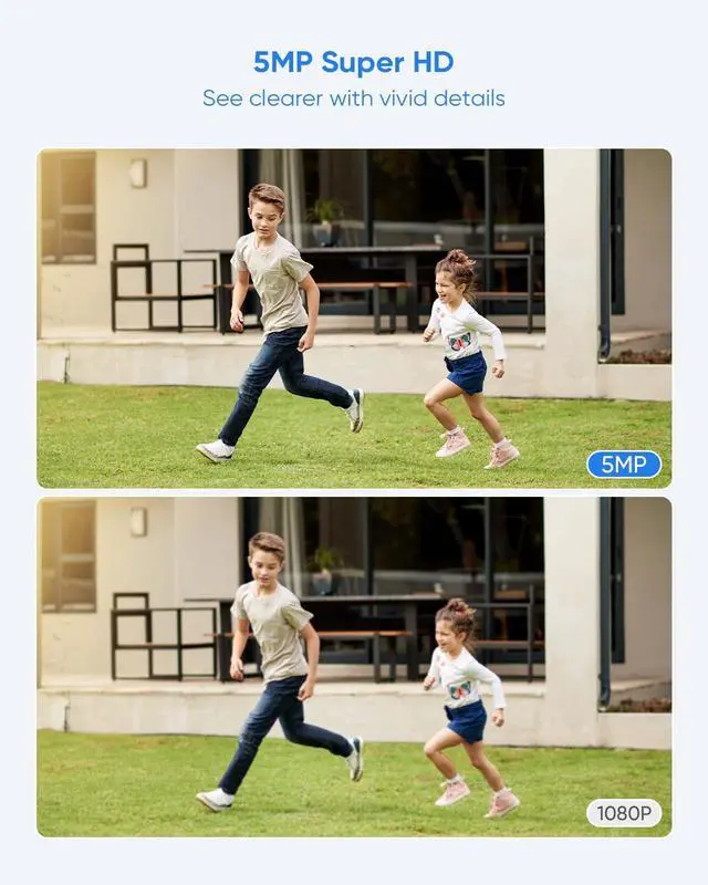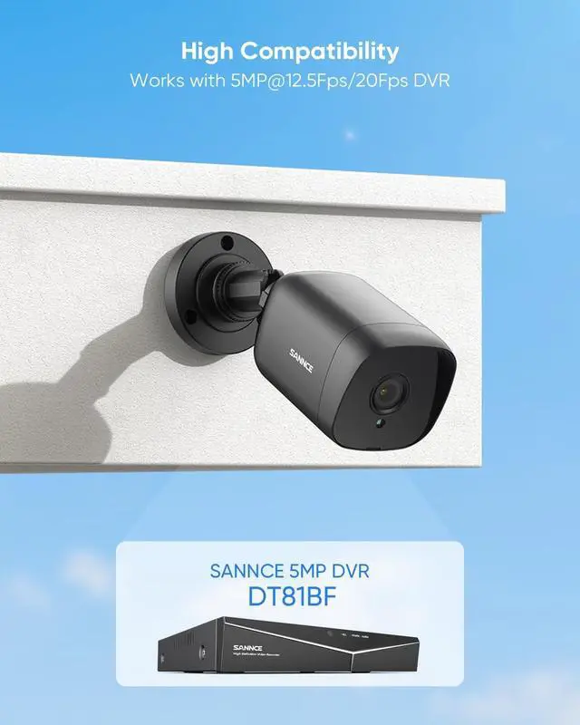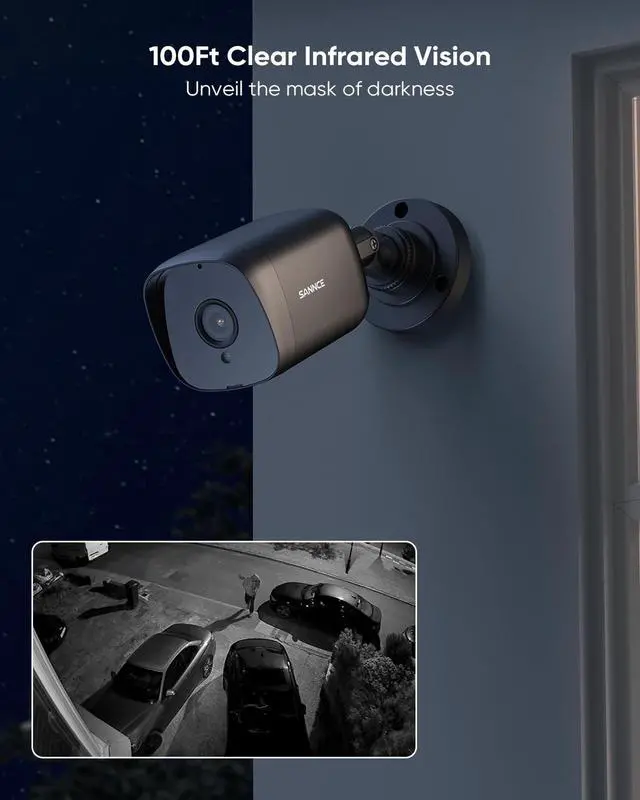 100 ft Crystal Night Vision12 built-in IR LEDs enable the camera to capture crisp images from up to 100 ft in poor lighting conditions. DNR technology removes the image noise for sharp image clarity even in the pitch-dark areas. ^^ 5MP Super HD FootagesThis camera records smooth video footage and clear pictures in 5MP Super HD. With sensor-powered Wide Dynamic Range technology, it adjusts lighting and enhances image detail, allowing you to clearly view objects even in challenging lighting environments. ^^ IP66 Waterproof for All ClimatesWith the IP66 weatherproof rating, SANNCE security camera can keep out dust, water, and air.