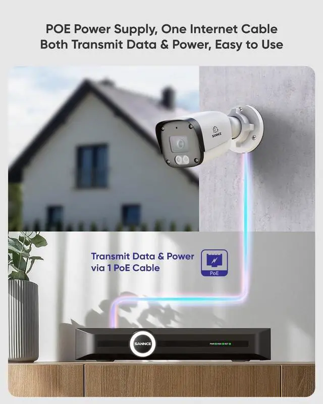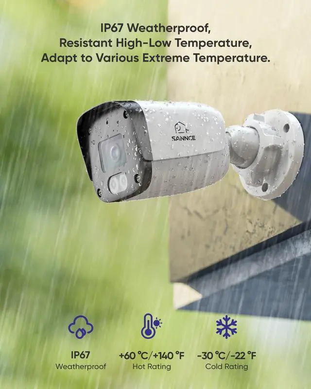 5MP Super HD Camera with CMOS SensorSANNCE PoE camera delivers 2880x1620 resolution via 1/ 2.7" Progressive Scan CMOS. BLC/3D DNR/HLC triple image tech ensures sharp details day/night. ^^ 100ft Dual IR Night Vision & 4mm Lens2 infrared arrays + 6-layer glass lens provide 100ft night vision. Smart IR-cut filter auto-switches day/night modes, while 3D digital noise reduction eliminates grain. ^^ Smart Motion Detection & Privacy ZoneHuman/vehicle detection triggers event markers in recordings (with N98PBM SERIES NVR). Custom privacy masks block sensitive areas while maintaining surveillance coverage. ^^ IP67 Weatherproof & Wide Temperature ToleranceRust-proof metal housing withstands -22F to 140F (-30~60) with IP67 waterproof rating.