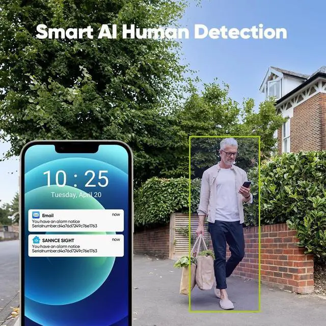 ^^ Wireless Camera with AI Detection & AlarmSANNCE outdoor camera's smart AI distinguishes humans/vehicles/pets, triggering 110dB alarm & app alerts. One-touch emergency button for instant response. ^^ IP66 WiFi Outdoor Camera & Night VisionSANNCE metal-clad wireless camera withstands storms (-4F~122F). 100ft IR night vision + 33ft full-color mode with automatic IR-cut filter.