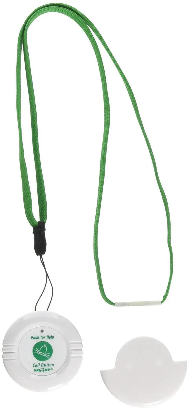 Smart Caregiver's 433-NC Wireless Nurse Call Button is used for residents to call for help. Designed to work with the Smart Caregiver Wireless Central Monitor Unit (433-CMU), Wireless Monitor (433-EC), or Wireless Caregiver Pager (TL-2020P). The button is easily worn around a neck by a supplied dark blue lanyard or comes with an optional white cradle for mounting to a headboard, wall, etc. Large green printed front graphics tell the resident to "PUSH FOR HELP" and a bell graphic shows where to push. Purchase multiple buttons for more than one resident or location throughout the facility or home.