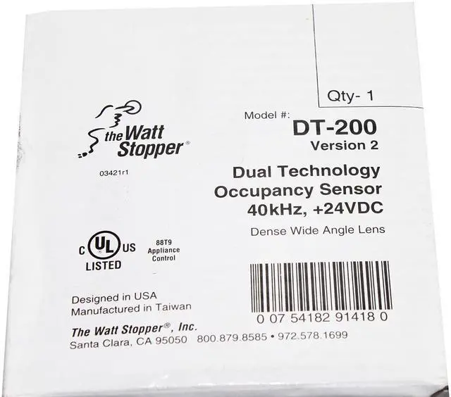The WattStopper DT200 Dual Technology occupancy sensors combine advanced passive infrared (PIR) and ultrasonic technologies into one unit. The combination of these technologies helps to eliminate false triggering problems even in difficult applications. The DT200 turns lighting systems on and off based on occupancy and ambient light levels. The DT200 offers numerous operating modes that can be combined to create the ideal custom control. The sensors can be confi gured to turn lighting on, and hold it on as long as either or both technologies detect occupancy. After no movement is detected for the duration of the time delay (5 to 30 minutes) the lights are switched off.